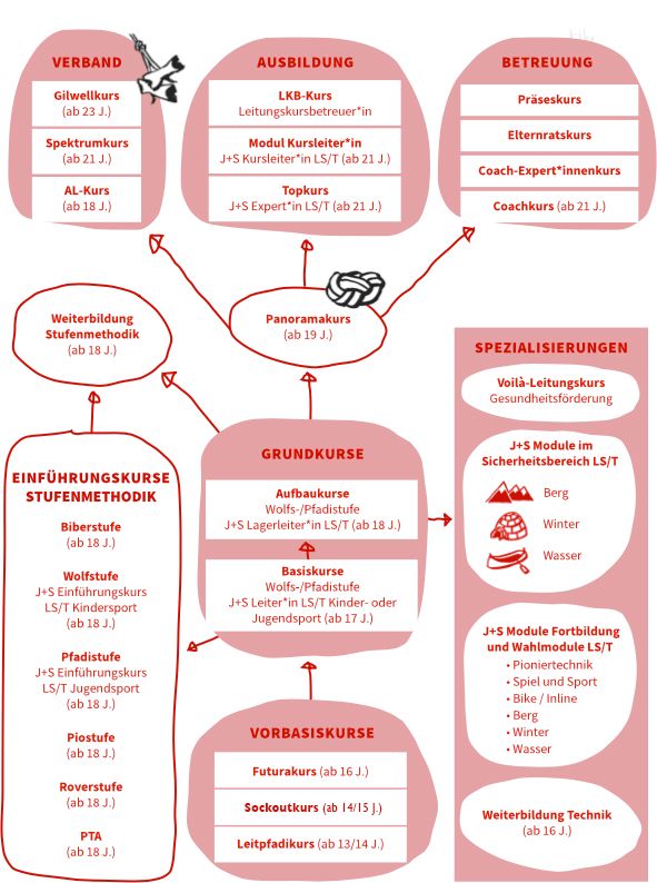 Das gesamte Ausbildungsmodell, inklusive der Beschreibung der einzelnen Kurse, findet sich auf der Website der Pfadibewegung Schweiz.